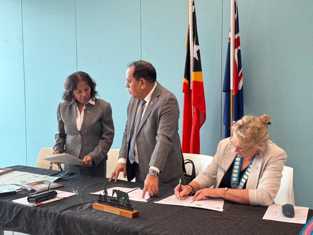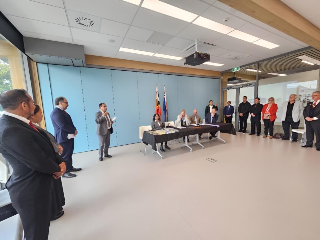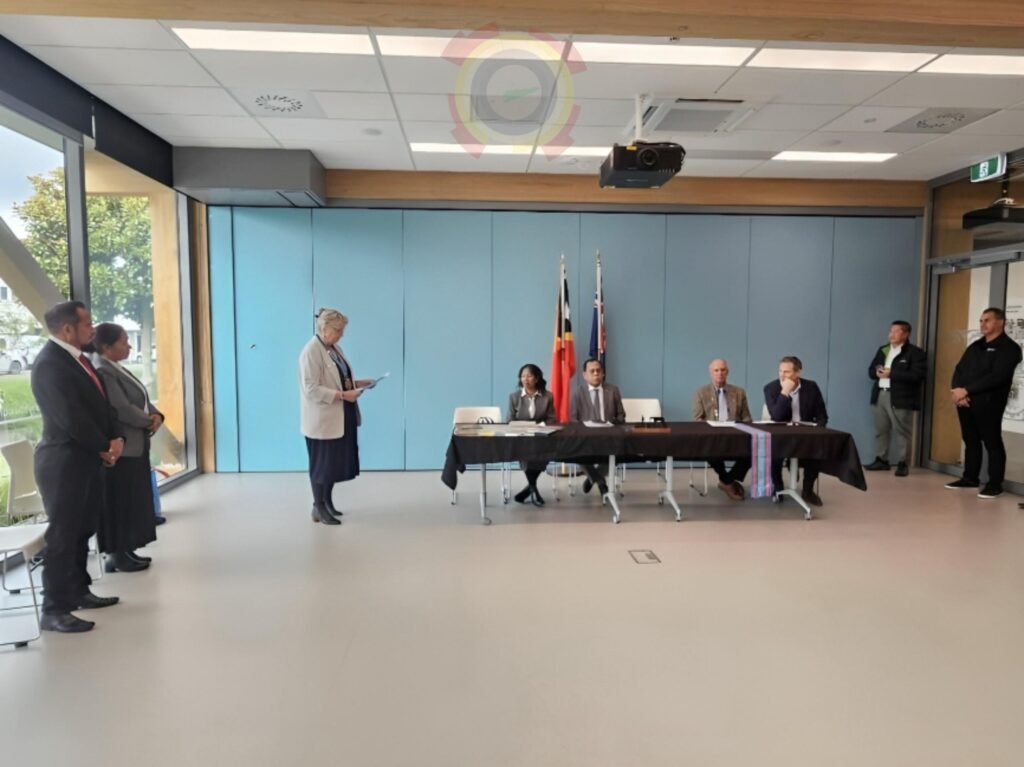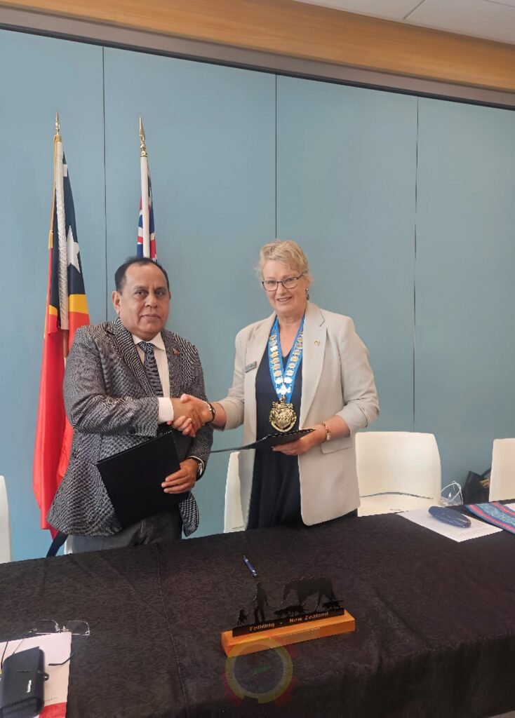 Smnewstl.com—Ministru Administrasaun Estatal, Tomás do Rosário Cabral,akompaña husi Embaixadora Timor-Leste ba Nova Zelandia,Idelta Maria Rodrigues, ho Prezidente Autoridade Munisípiu Covalima Miguel Armanda Cardoso,partisipa iha serimónia asinatura Memorandum of Understanding (MoU) sobre friendship city (Cidade amiga) entre Munisípiu Covalima (Timor-Leste) no Munisípiu Manawatu (Nova Zelandia) hodi hametin lasu amizade entre komunidade no autoridade husi Munisípiu rua ne’e rasik, no serimónia ne’e realiza iha Manawatu Community Hub Library Tui Mayo Room.