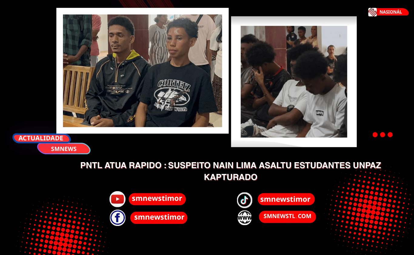 SMnewstl.com | DILI, 16 Abril 2026 – Polísia Nasionál Timor-Leste (PNTL), liuhusi Eskuadra Dom Aleixo, konsege kaptura suspeitu nain lima ne’ebé alegadamente envolve iha kazu asaltu hasoru est(/SMnews)udante Universidade da Paz (UNPAZ), ne’ebé akontese iha área Escola hafoin video refere sirkula luan iha rede sosial.