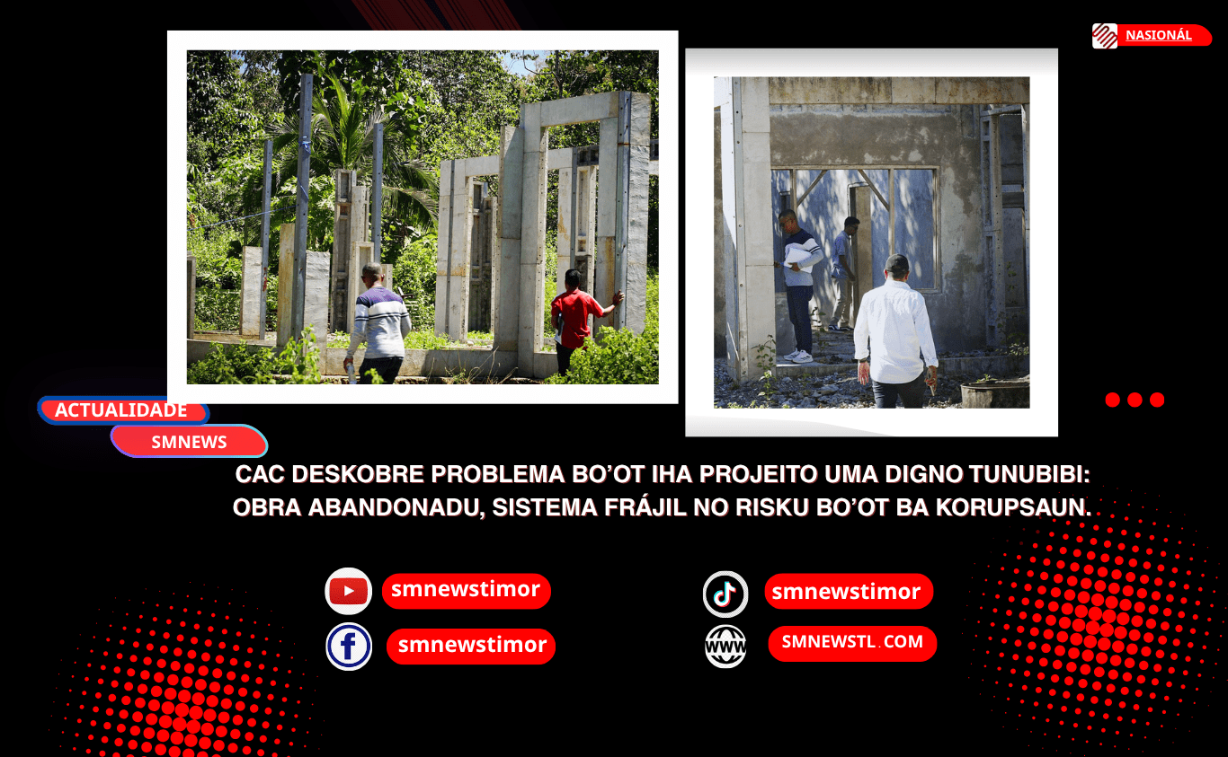 SMnewstl.com BOBONARO |16 Abril 2026 — Comissão Anti-Corrupção (CAC) deskobre problema boot no kompleksu iha implementasaun projetu konstrusaun UMA DIGNU unidade 25 iha Tunubibi, Munisípiu Bobonaro, ne’ebé agora dadaun konsidera iha kondisaun grave.