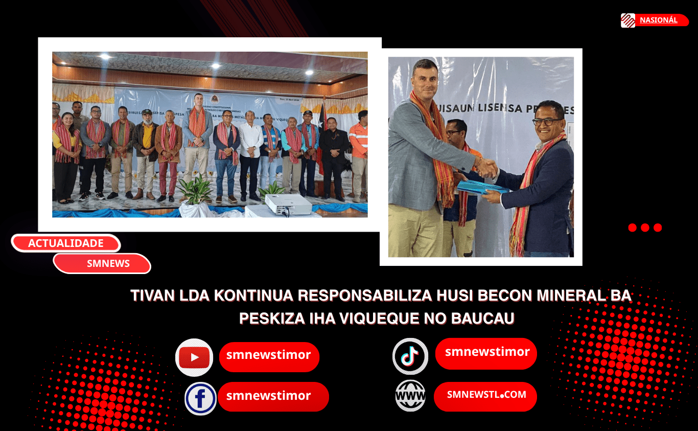 SMnewstl.com | VIQUEQUE 23 Abril 2026 –Autoridade Nasional dos Minerais, ANM I.P., atribui lisensa ba propesaun no peskiza minerais metáliku ba empreza Tivan LDA, iha Postu Administrativu Venilale, Munisípiu Baucau no Munisípiu Viqueque.